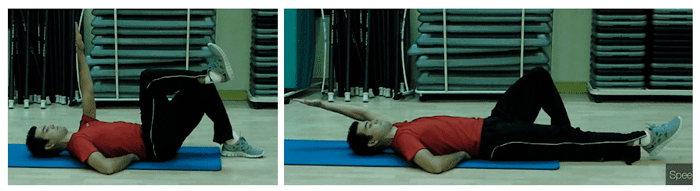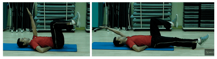 El objetivo de este ejercicio es controlar al máximo nuestra área lumbo-pélvica mientras se produce movimiento en las extremidades. Se observa que se coloca una mano en la zona lumbar para tener “feedback” en tiempo real sobre cualquier movimiento no deseado en esta área.
