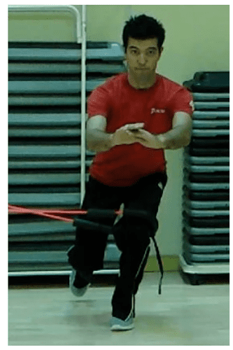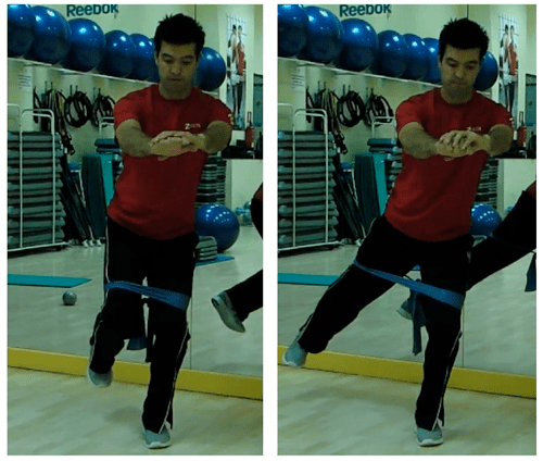 Al igual que hicimos con el control lumbo-pélvico, debemos trasladar ese control de la musculatura de la cadera adquirido en el suelo a posiciones más verticales que se asemejen más a las demandas más integradas. En este caso la resistencia que ofrece la goma está intentando desestabilizar la pierna de apoyo, desarrollando así una capacidad reactiva de la musculatura de la cadera de la pierna de apoyo. Esto resultará en un control mucho más efectivo de todo el tren inferior, en especial de la rodilla.