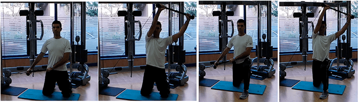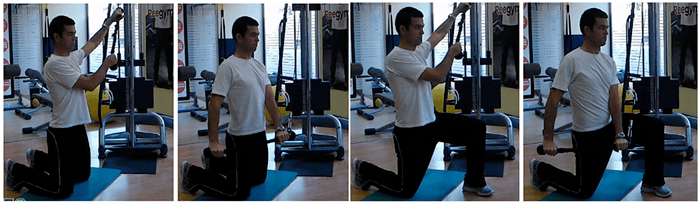 Habiendo desarrollado el control lumbo-pélvico en el suelo, deberemos progresarlo a posiciones más verticales que generen mayor transferencia hacia la actividad funcional. El objetivo no es rotar el tronco, sino ser capaz de mantener la posición de la columna mientras se tira de la polea con los brazos. Las diferentes posiciones de piernas generan diferentes demandas sobre la musculatura de la cadera.